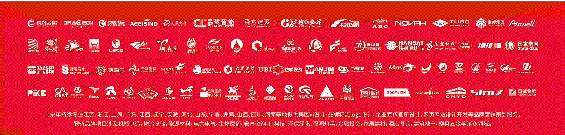 機(jī)械制造,物流倉儲,新能源新材料,電力電氣,生物醫(yī)藥,工業(yè)設(shè)備,教育咨詢,IT科技,環(huán)保綠化,照明燈具,金融投資,家居建材,酒店餐飲,房地產(chǎn),汽車,模具五金,工程建筑,水處理,大氣污染治理等行業(yè)集團(tuán)公司提供集團(tuán)vi設(shè)計,logo設(shè)計,商標(biāo)標(biāo)志設(shè)計,企業(yè)樣本,宣傳宣傳冊設(shè)計印刷,包裝設(shè)計,品牌營銷策劃,企業(yè)網(wǎng)站開發(fā)服務(wù)。