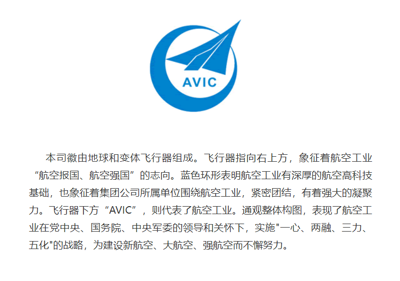 本司徽由地球和變體飛行器組成。飛行器指向右上方,象征著航空工業(yè)“航空報國、航空強國”的志向。藍色環(huán)形表明航空工業(yè)有深厚的航空高科技基礎(chǔ),也象征著集團公司所屬單位圍繞航空工業(yè),緊密團結(jié),有著強大的凝聚力。飛行器下方“AVIC”,則代表了航空工業(yè)。通觀整體構(gòu)圖,表現(xiàn)了航空工業(yè)在黨中央、國務(wù)院、中央軍委的領(lǐng)導和關(guān)懷下,實施"一心、兩融、三力、五化"的戰(zhàn)略,為建設(shè)新航空、大航空、強航空而不懈努力。