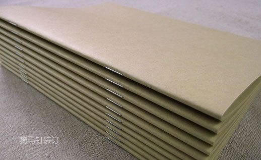 1.騎馬訂裝:將書冊套貼配頁,書脊打訂書釘,三面裁切成冊